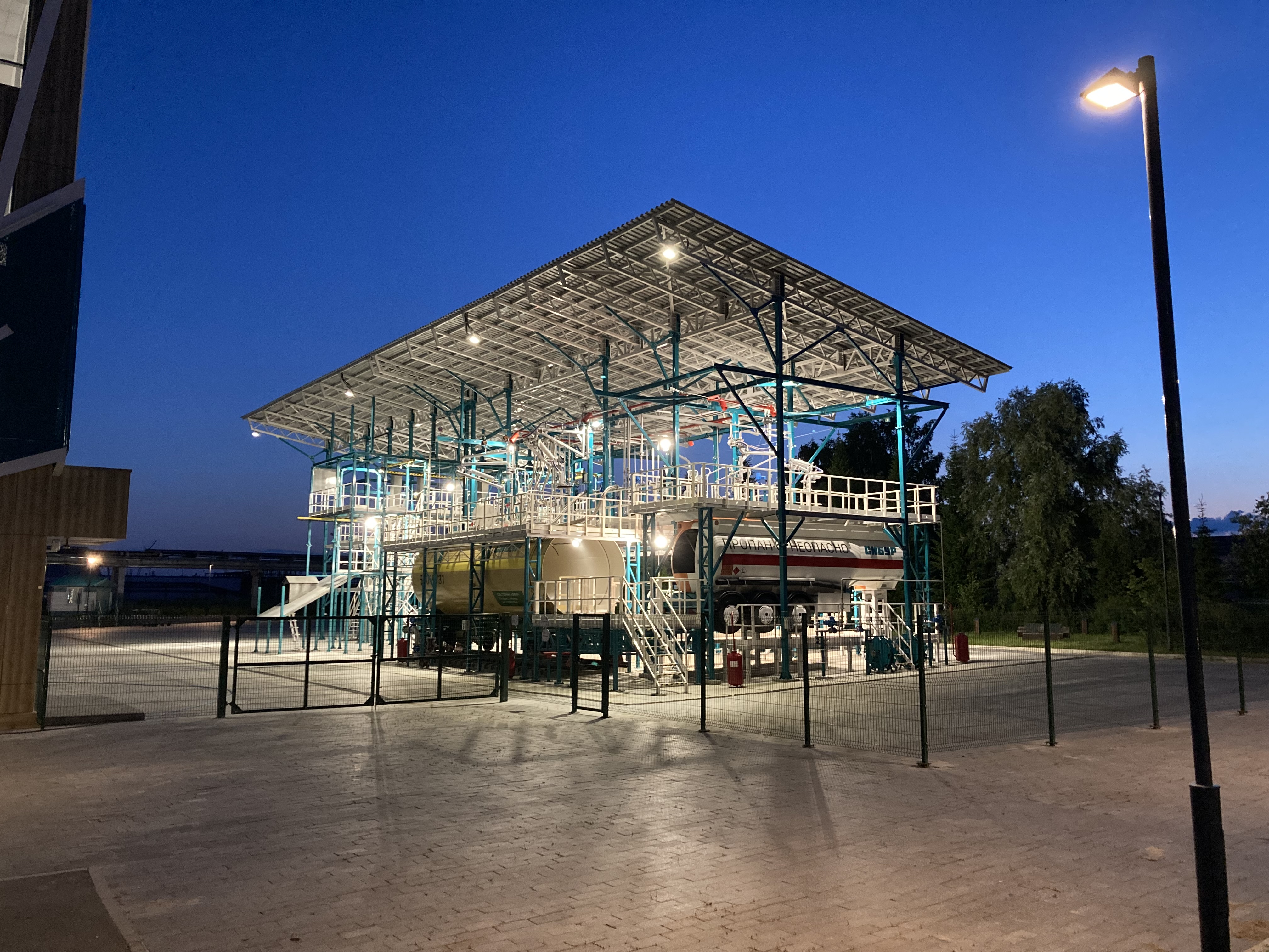 Учебный полигон «Сливо-наливная эстакада» представляет собой масштабную площадку длиной 39 м, шириной 15 м и высотой 12,2 м, общим весом 128 377 кг. Она оборудована надежной крышей для защиты от атмосферных осадков, эффективными системами освещения и комплексными мерами безопасности, включая ограждение по периметру. На бетонированной площадке размещены полноразмерные имитации: