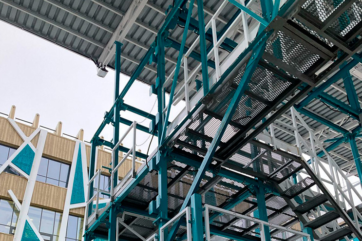 Основу полигона составляют вертикальные стальные рамы, соединенные переходными мостиками и площадками различного уровня сложности. Конструкция включает имитацию промышленных объектов: резервуаров, трубопроводов и технологических выступов, что позволяет отрабатывать реальные производственные сценарии. Особое внимание уделено системе креплений для страховочного оборудования, соответствующей требованиям ГОСТ Р 12.4.258-2015.